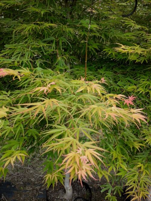 Acer palmatum ‘Scolopendrifolium’ is an elegant deciduous tree originating from Japan. With a strong upright, bushy habit, it creates a graceful presence in the garden. Its long, narrow leaves are bright green, often tipped with soft salmon tones, adding subtle seasonal interest. As autumn arrives, the foliage transforms into striking shades of apricot, orange, and yellow. These vibrant colours provide a stunning display, ensuring the tree becomes a focal point in smaller gardens and courtyards. This maple thrives in moist, well-drained soil and grows happily in sun or semi-shade. However, it benefits from shelter from wind, which helps prevent leaf scorch and keeps the foliage looking fresh throughout the seasons. Reaching approximately 5m high and 3m wide, it makes an ideal light shade tree. With its compact size, it suits modern landscapes and provides a delicate canopy for outdoor spaces. Interestingly, the epithet Scolopendrifolium was chosen by botanists to describe its deeply cut, finger-like leaves. Resembling small insect legs, these unique shapes give the tree its distinctive character and enduring charm.