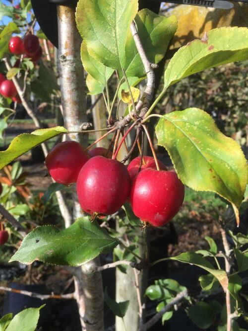 A strong growing smaller tree bearing masses of white tinged pink flowers from red buds in spring. In autumn clusters of large bright crimson fruit flushed orange and yellow. One of the best crab-apples for production of fruit suited for jelly’s and jams. Ideal for smaller gardens.